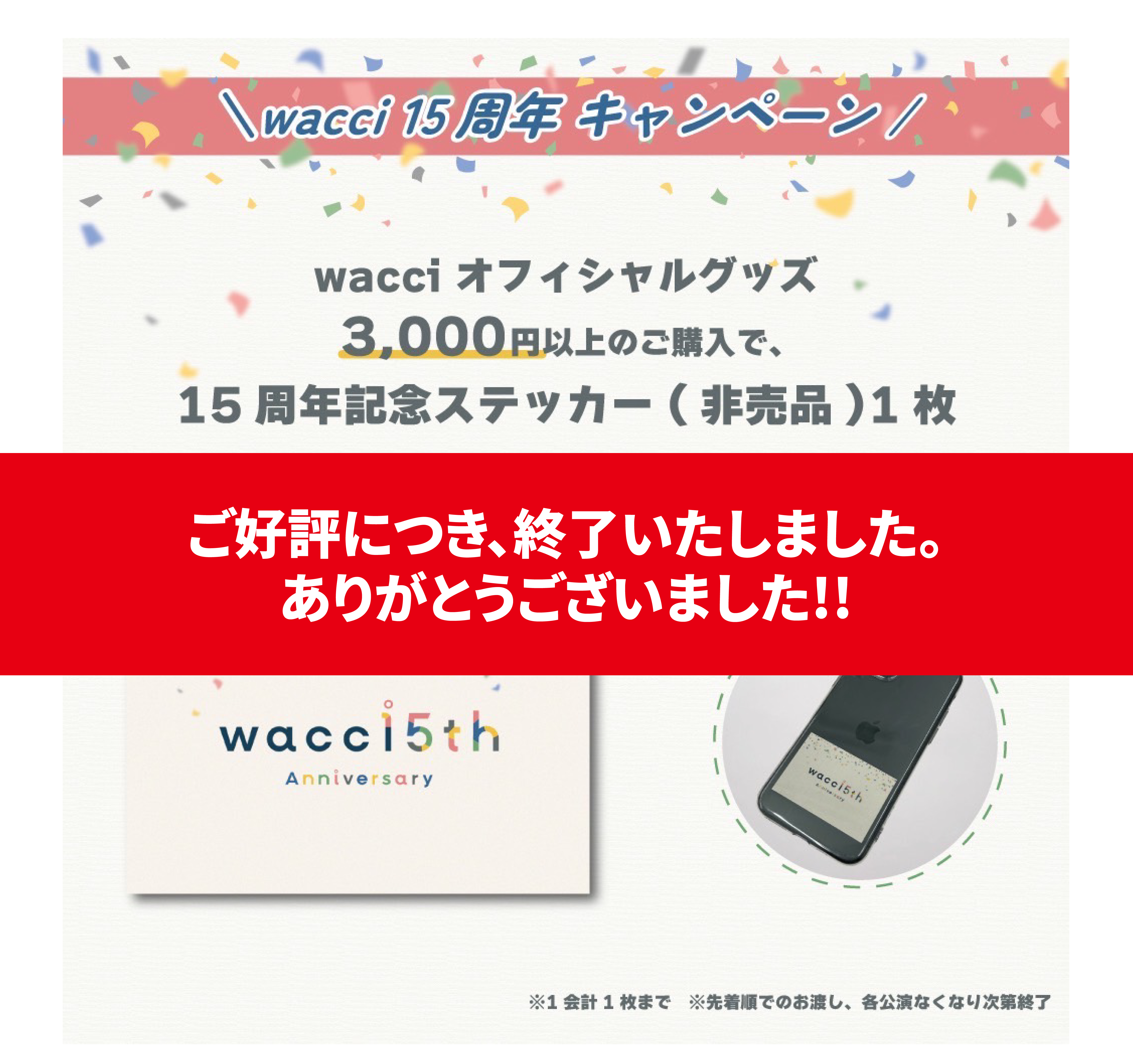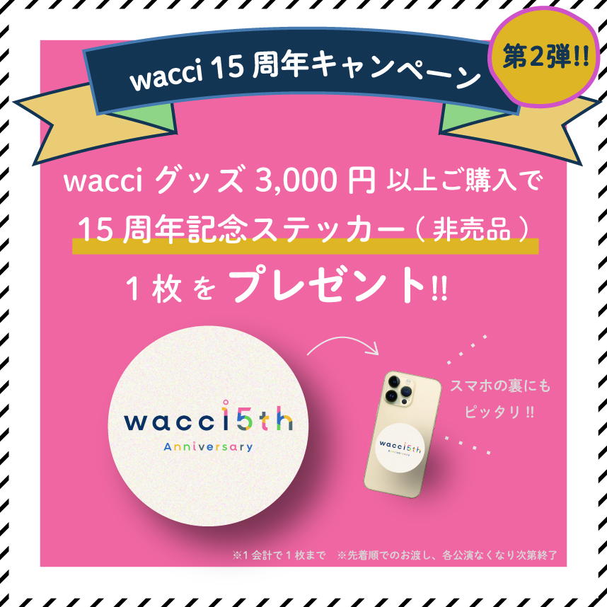 メンバーが出演する各イベントでwacciオフィシャルグッズ<3,000円以上>のご購入で15周年のロゴを使用した記念ステッカー(非売品)を1枚プレゼント!